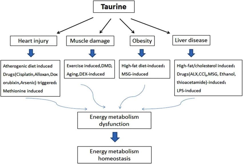 تائورین یا آمینو سولفونیک اسید به طور طبیعی در بدن به عنوان آمینواسید تولید می شود، نقش اصلی این ماده در بدن شامل حفظ هیدراتاسیون و تعادل الکترولیتها در سلولهای بدن، کمک به هضم توسط تشکیل نمکهای صفراوی، ایجاد تعادل در انتقال مواد معدنی به درون سلولها، کمک به فعالیتهای چشم و سیستم عصب مرکزی است. همچنین تائورین دارای خاصیت آنتی اکسیدانی است و به کاهش خستگی عضلات، تنظیم دمای بدن، پیشگیری از پیشرفت نارسایی قلبی، افزایش توانایی جهت تمرین و نیز بالا بردن قدرت تمرکز نیز کمک می کند.